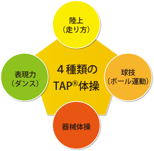 TAP 体操は1陸上 ( 走り方 )、2球技 ( ボール 運動 )、3器械体操、4表現力 ( ダンス ) の 4 種類あります。